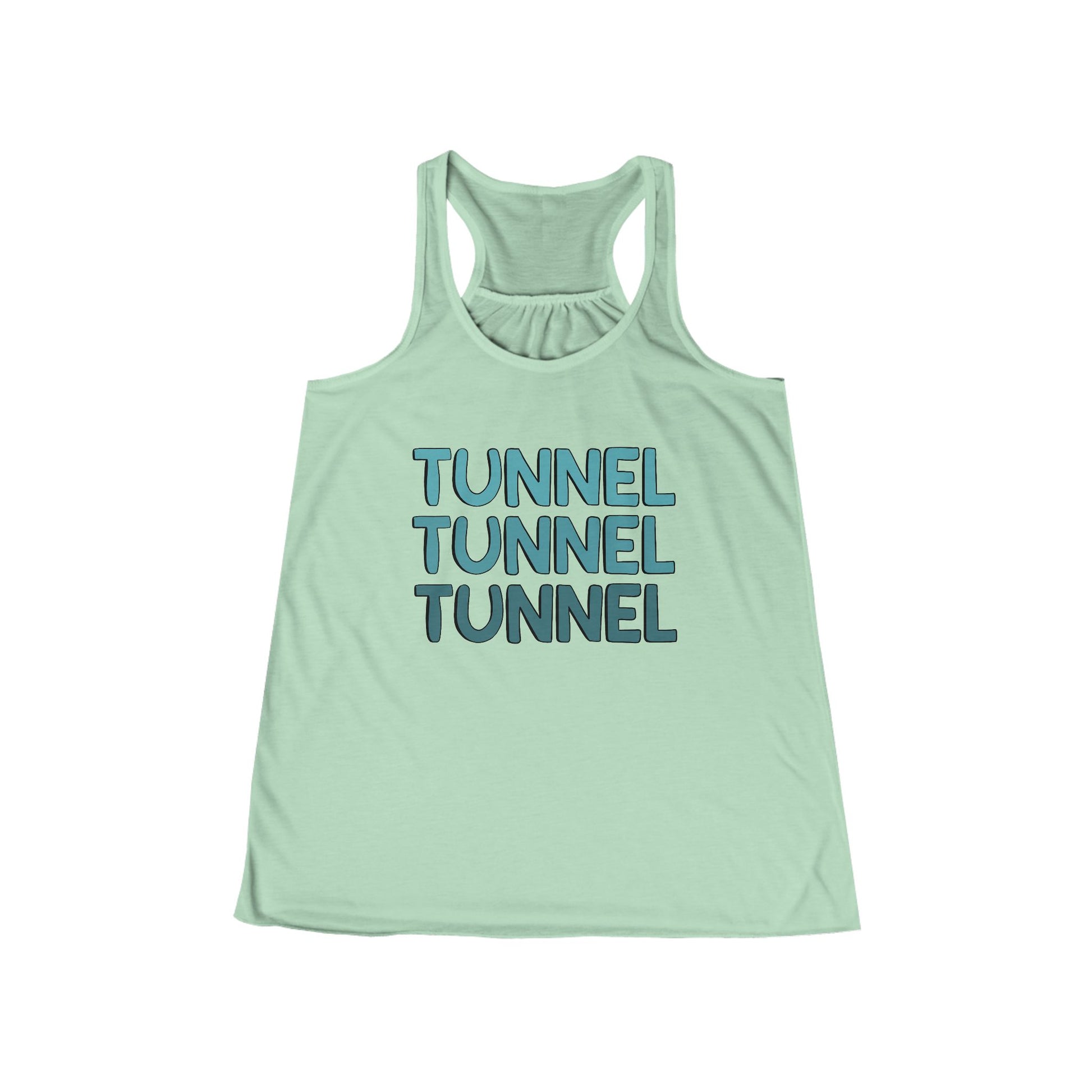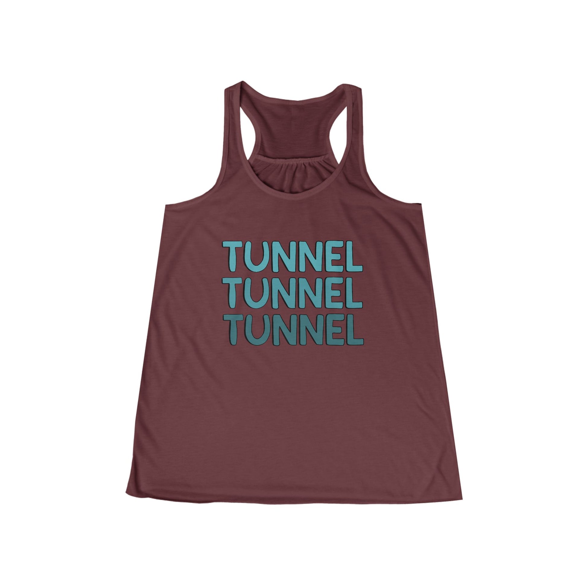 Our Tunnel Tunnel Tunnel design with no floral! This women's flowy racerback tank is the go-to tank for sporty types. It boasts a flowy look that flatters the silhouette. A surefire method to turn heads, a customized racerback tank looks great and feels better. Overlocking side seams hold the shape of the strong polyester material. A self-fabric binding with overlock is both decorative and protective.